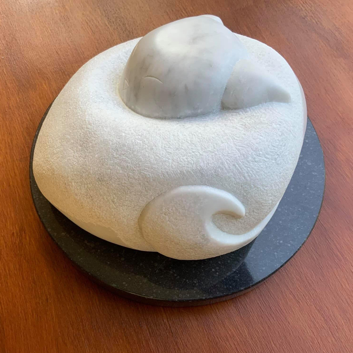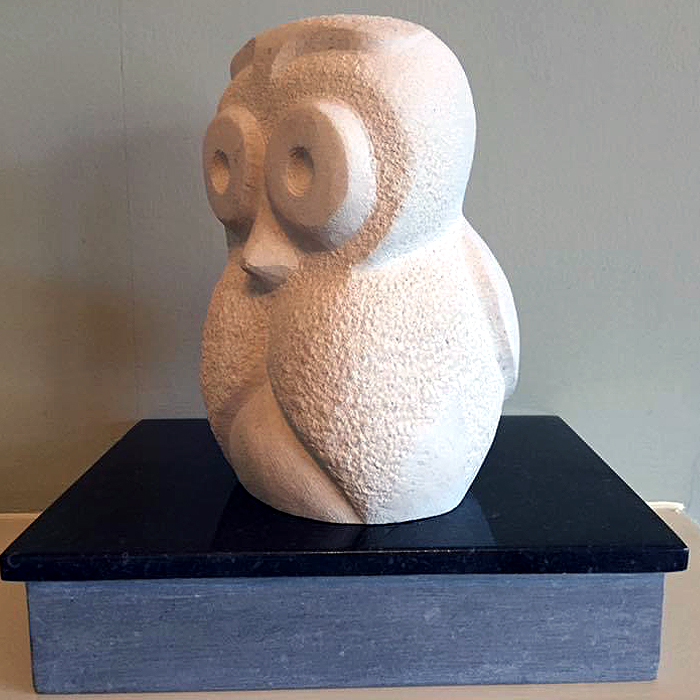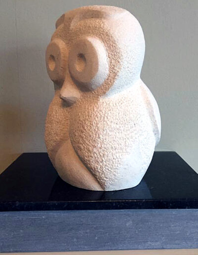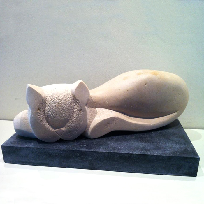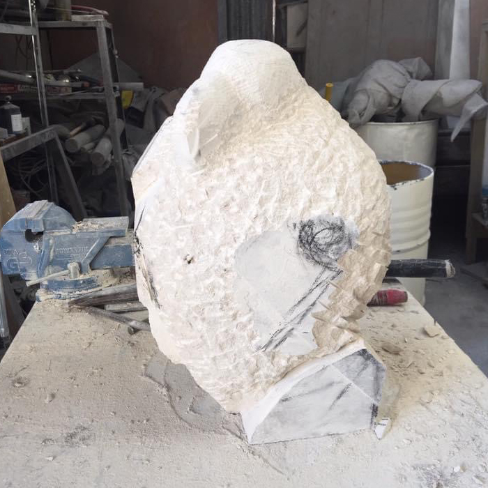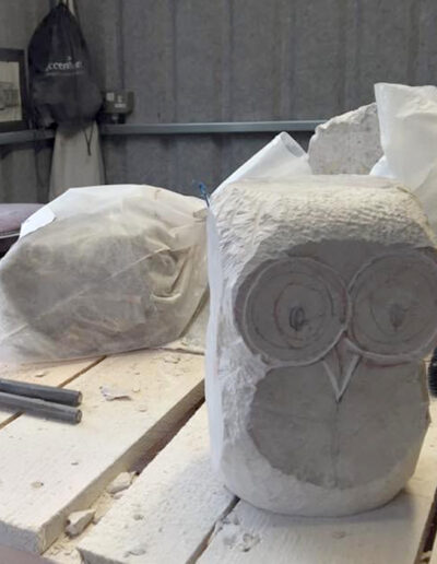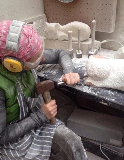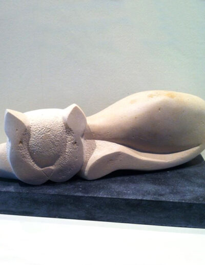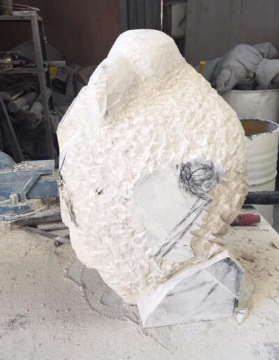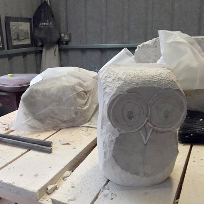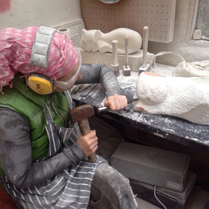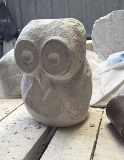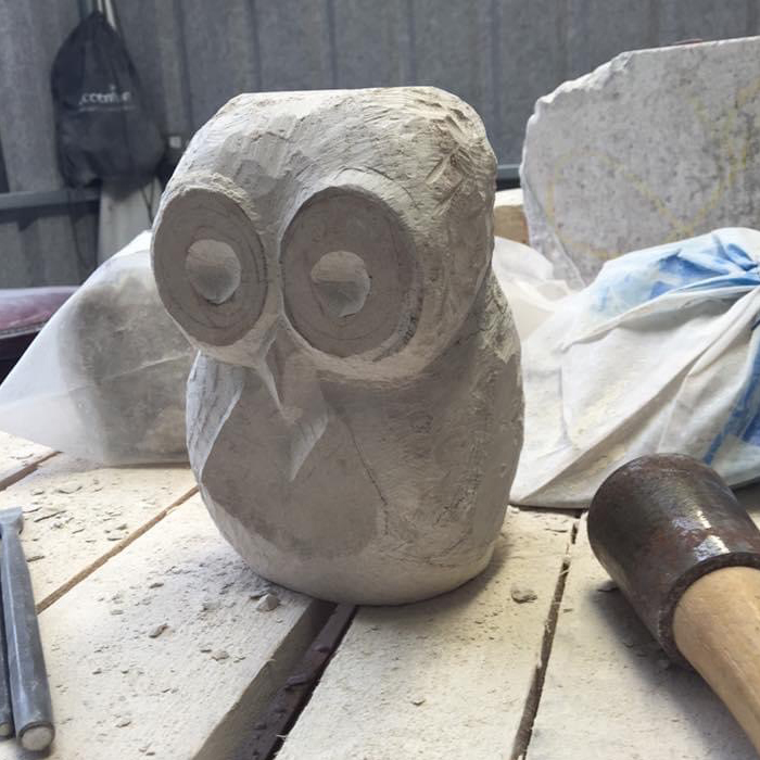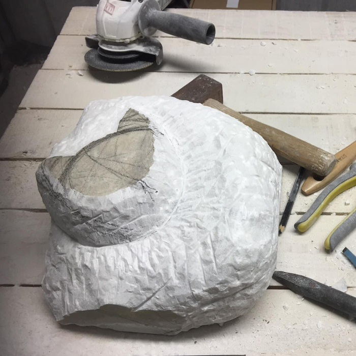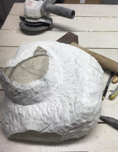 I start with a block of stone [marble or limestone] and after marking out certain details with a pencil I use a point chisel and a small angle grinder to rough out the form of a small animal, it could be a cat, a fox or an owl.